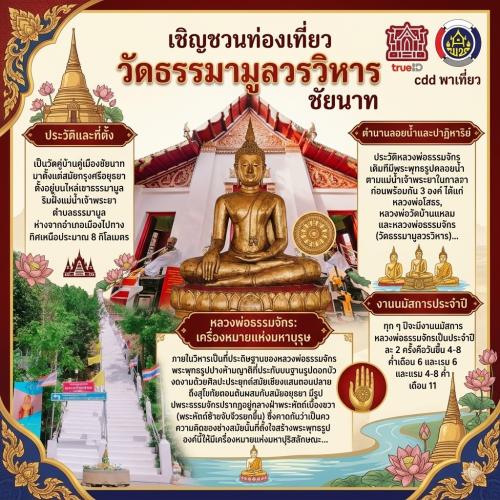 สำนักงานพัฒนาชุมชนอำเภอเมืองชัยนาท ขออนุญาตประชาสัมพันธ์ เชิญชวนท่องเที่ยว ชุมชนท่องเที่ยว OTOP นวัตวิถี วัดธรรมามูลวรวิหาร จังหวัดชัยนาท วัดคู่บ้านคู่เมืองสมัยกรุงศรีอยุธยาบนไหล่เขาธรรมามูลริมแม่น้ำเจ้าพระยา สักการะ "หลวงพ่อธรรมจักร" พระพุทธรูปปางห้ามญาติศิลปะผสมผสาน มีตำนานเป็นหนึ่งในพระลอยน้ำสามองค์ ชมความงามปาฏิหาริย์ที่หยุดลอยหน้าวัดและประดิษฐานปิดประตูวิหาร ชาวบ้านศรัทธาสูง มีงานนมัสการประจำปีละ 2 ครั้ง วันขึ้น 4-8 ค่ำ เดือน 6 และ แรม 4-8 ค่ำ เดือน 11